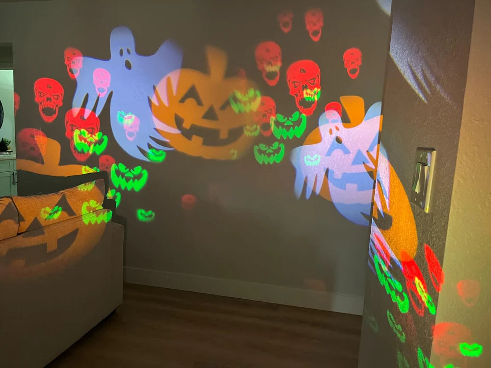 It projects spooky Halloween patterns like ghosts, pumpkins, bats, and more, creating a festive and eerie atmosphere for any space.